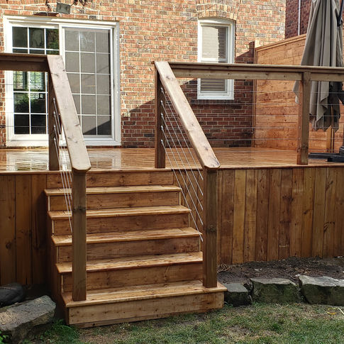 Raised level deck with cable railing in Leaside, Toronto